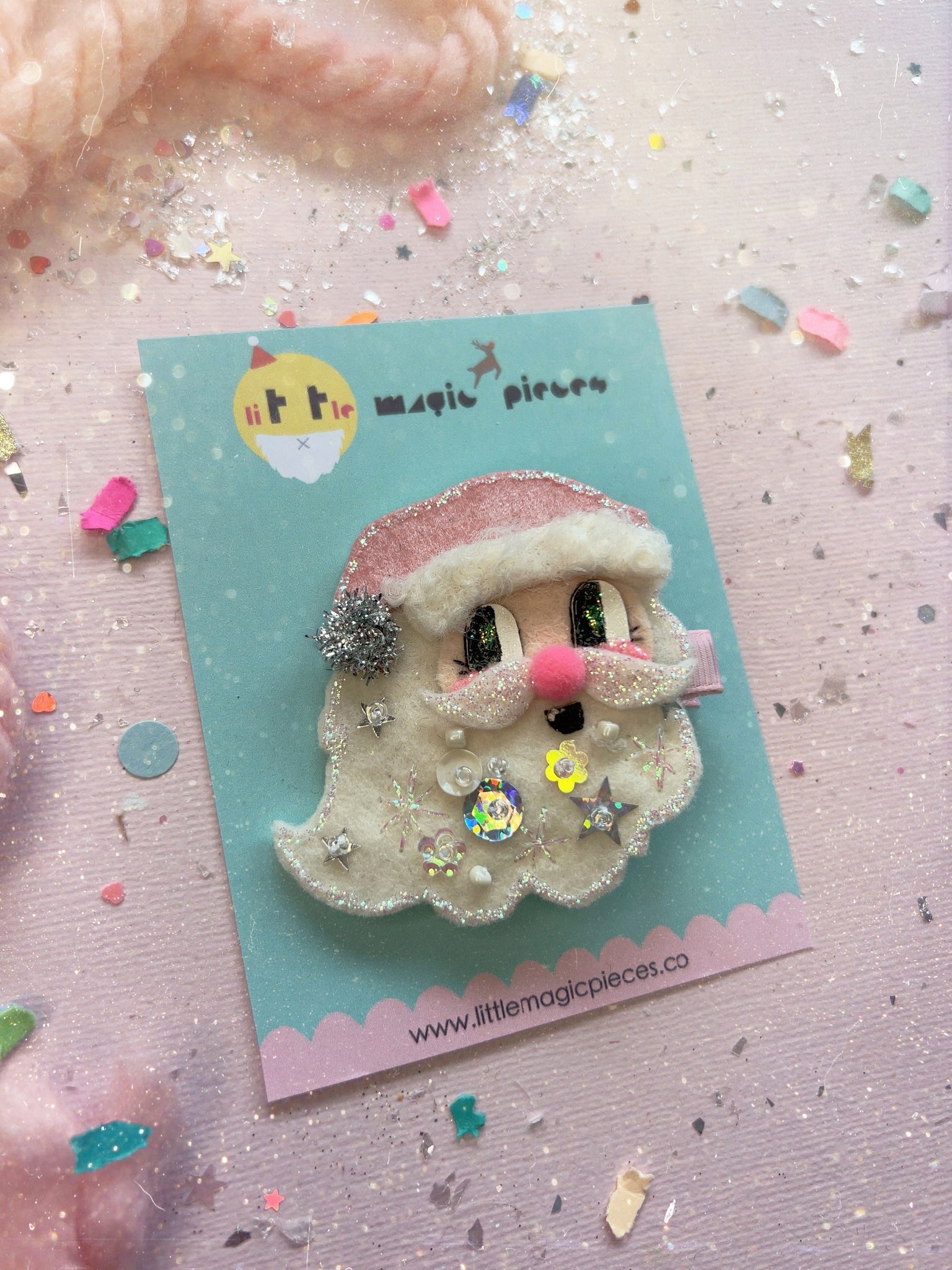 Bring a touch of holiday magic to your little one's look with our Nostalgic, but Pink Santa Glitter Hair Clip! This adorable accessory features a classic Santa design, complete with glittery details that capture the joy of Christmas.